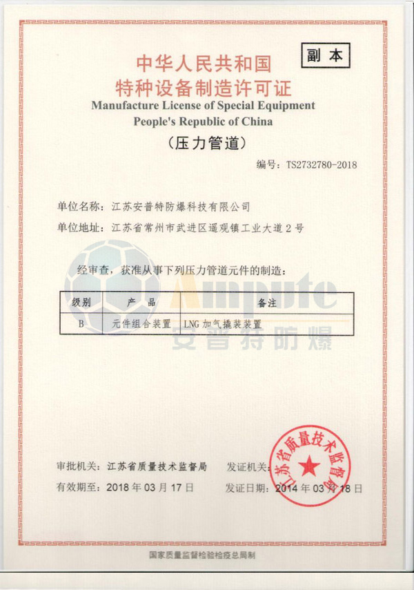 压力管道元件制造(LNG加气撬装装置) B级